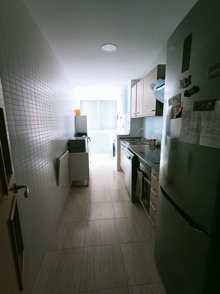 En la zona de día, la cocina se integra con el comedor mediante un diseño limpio y coherente: mobiliario en tonos piedra, encimera de mármol blanco veteado y detalles en madera clara que generan continuidad visual.